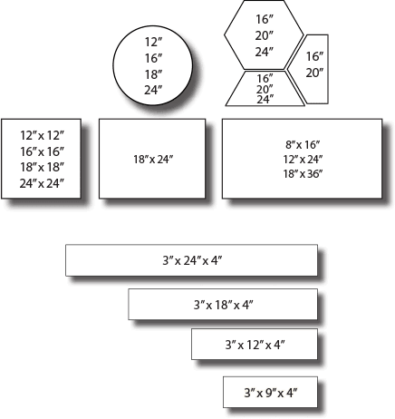 | 18" x 18" x 1-3/4" | 18" x 24" x 1-3/4" | 18" x 36" x 1-3/4" |